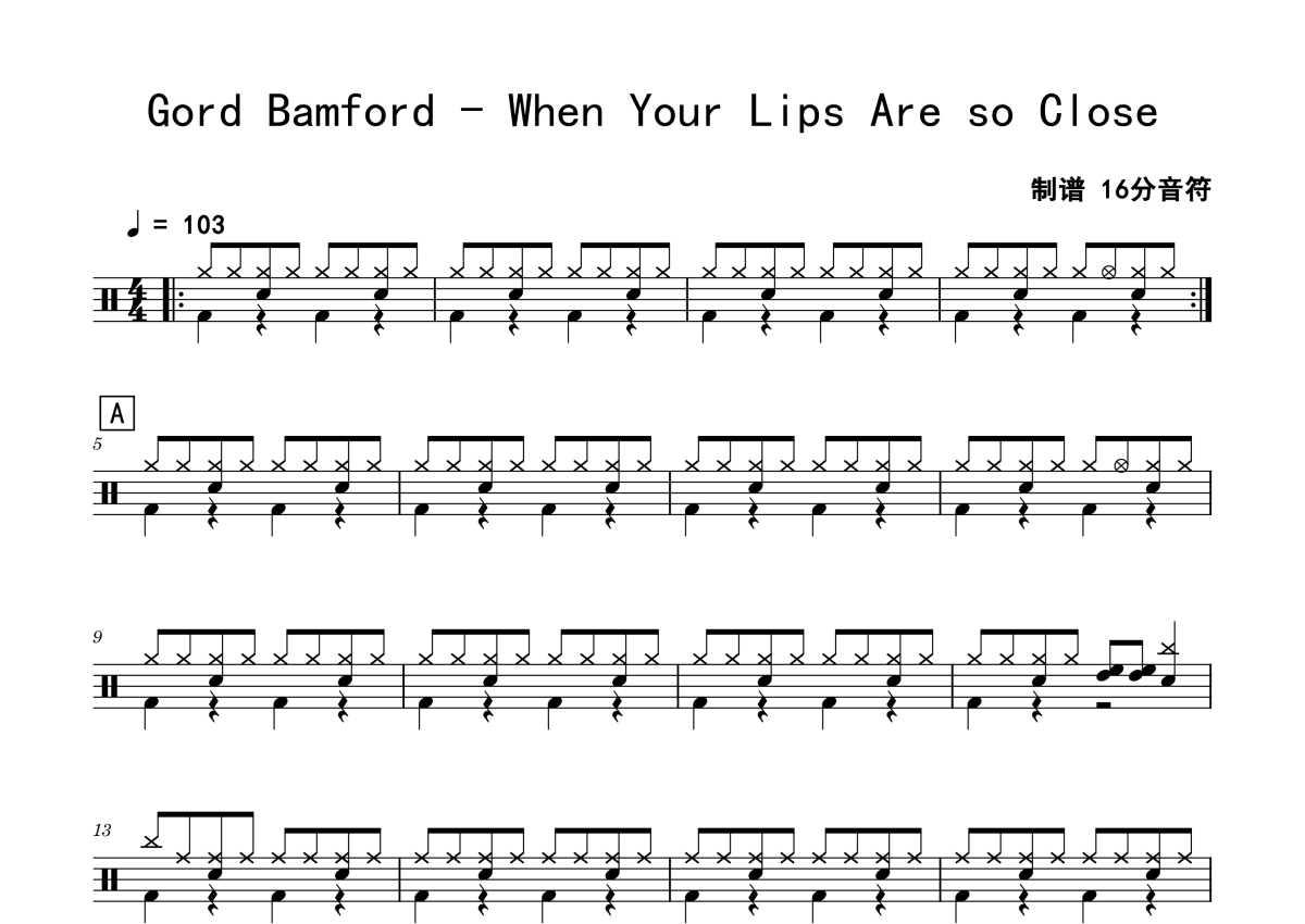 《When Your Lips Are so Close》是Gord Bamford演唱的一首歌曲,拍号为4/4拍,歌曲速度为每分钟103拍,这份鼓谱共有两张高清图谱,图谱由 @老虎不说谎 编配上传,图谱使用五线谱编配,使用这份When Your Lips Are so Close架子鼓谱,你将能够轻松地敲打出这首Gord Bamford的When Your Lips Are so Close,快来尝试吧。
