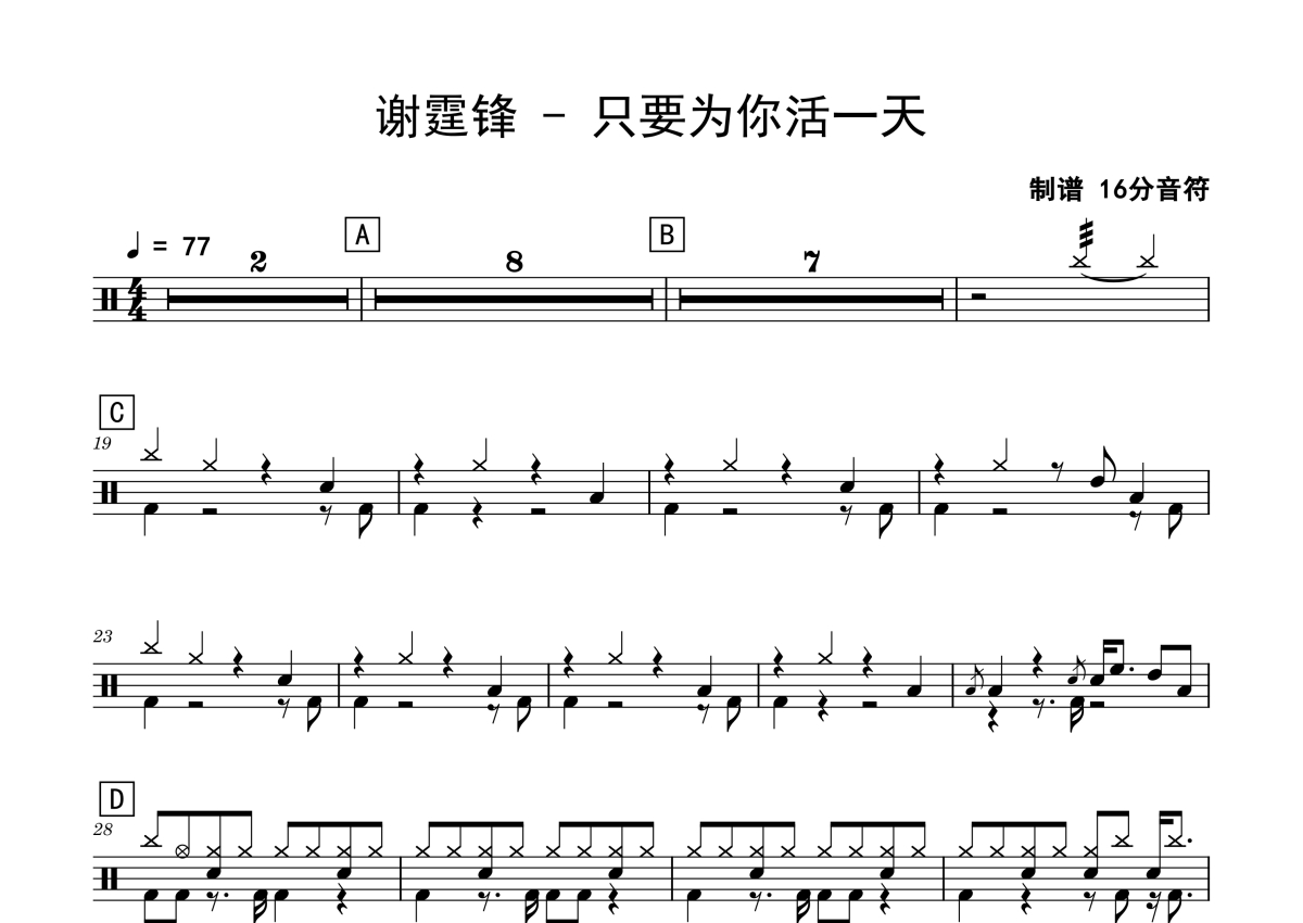 《只要为你活一天》是谢霆锋演唱的一首歌曲,拍号为4/4拍,歌曲速度为每分钟77拍,这份鼓谱共有两张高清图谱,图谱由 @老虎不说谎 编配上传,图谱使用五线谱编配,使用这份只要为你活一天架子鼓谱,你将能够轻松地敲打出这首谢霆锋的只要为你活一天,快来尝试吧。