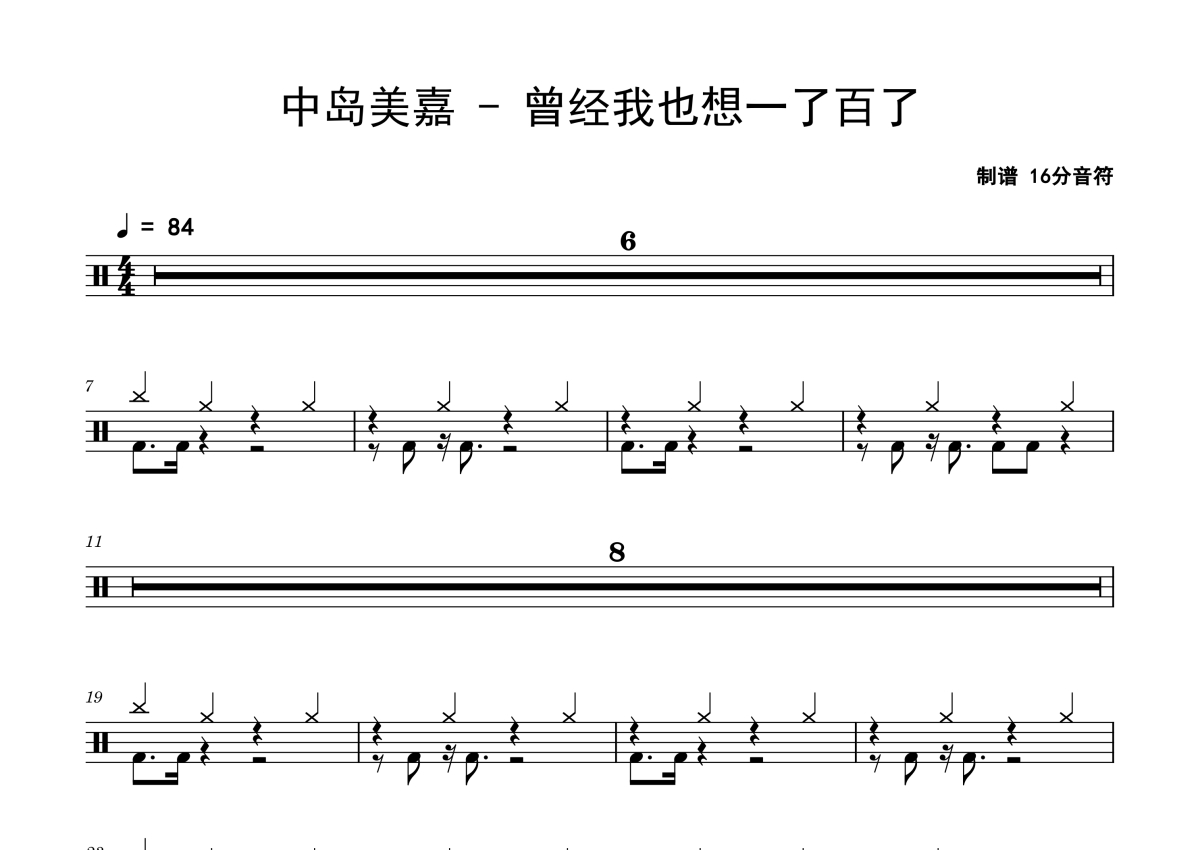 《曾经我也想一了百了》是中岛美嘉演唱的一首歌曲,拍号为4/4拍,歌曲速度为每分钟84拍,这份鼓谱共有三张高清图谱,图谱由 @老虎不说谎 编配上传,图谱使用五线谱编配,使用这份曾经我也想一了百了架子鼓谱,你将能够轻松地敲打出这首中岛美嘉的曾经我也想一了百了,快来尝试吧。