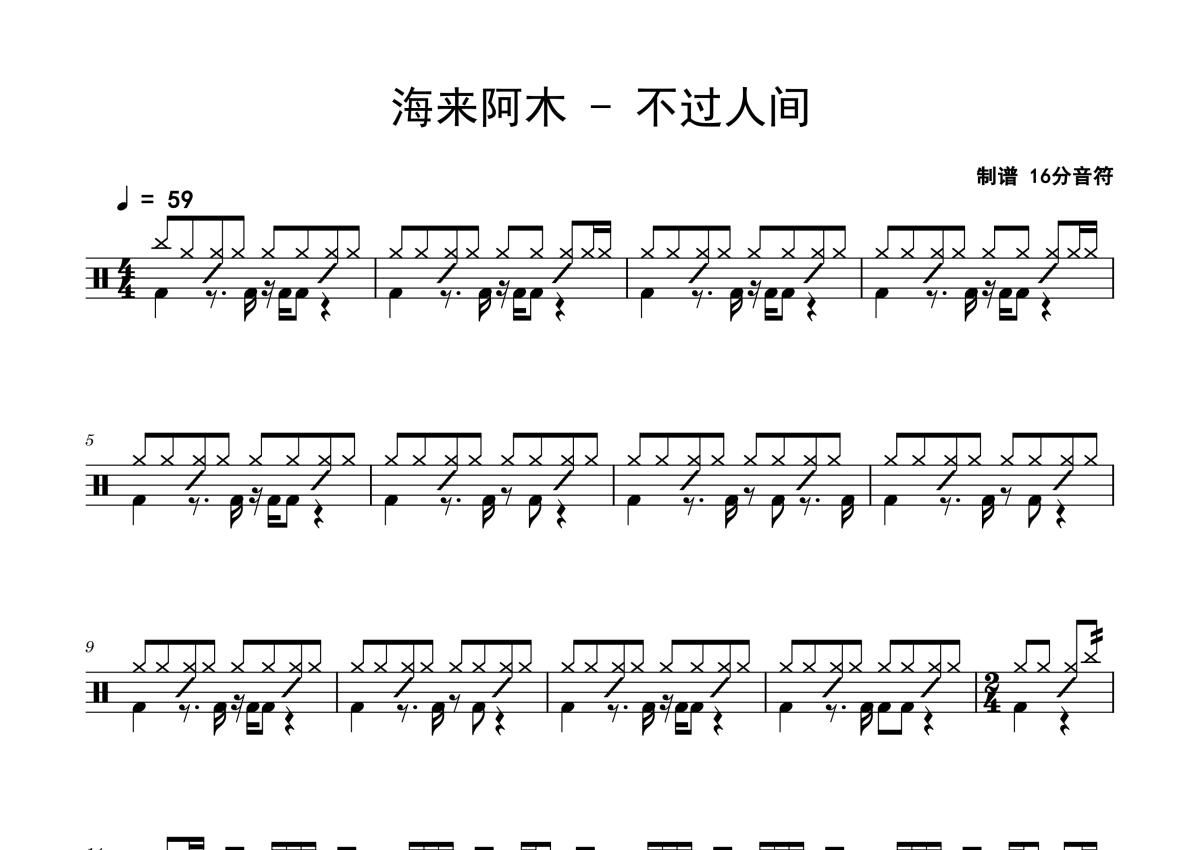《不过人间》是海来阿木演唱的一首歌曲,拍号为4/4拍,歌曲速度为每分钟59拍,这份鼓谱共有两张高清图谱,图谱由 @老虎不说谎 编配上传,图谱使用五线谱编配,使用这份不过人间架子鼓谱,你将能够轻松地敲打出这首海来阿木的不过人间,快来尝试吧。