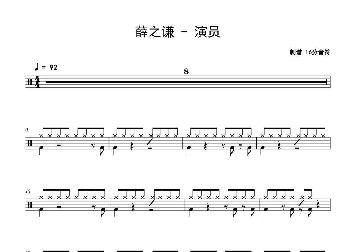 《演员》是薛之谦演唱的一首歌曲,拍号为4/4拍,歌曲速度为每分钟92拍,这份鼓谱共有三张高清图谱,图谱由 @老虎不说谎 编配上传,图谱使用五线谱编配,使用这份演员架子鼓谱,你将能够轻松地敲打出这首薛之谦的演员,快来尝试吧。