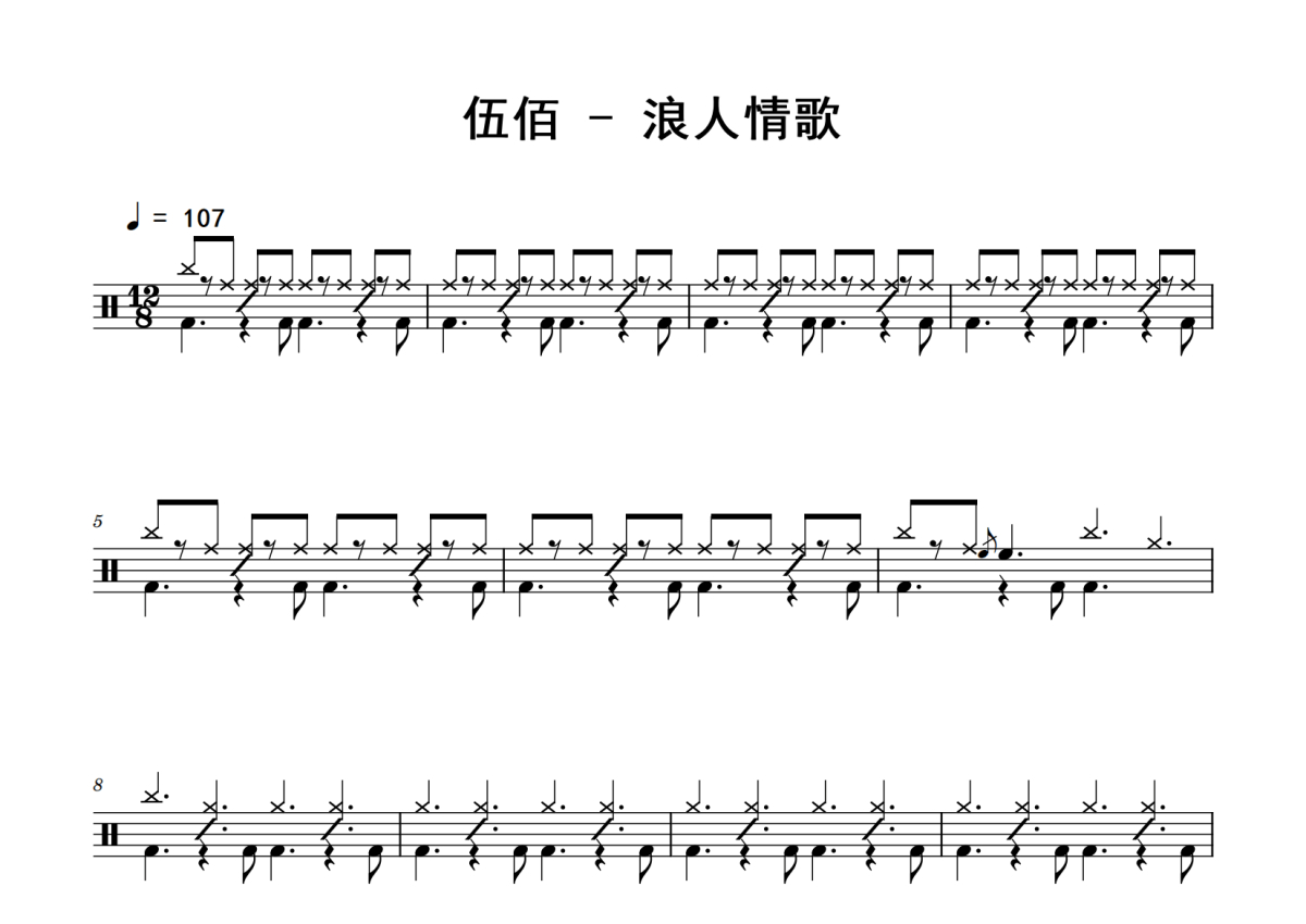 《浪人情歌》是伍佰演唱的一首歌曲,拍号为4/4拍,歌曲速度为每分钟107拍,这份鼓谱共有三张高清图谱,图谱由 @老虎不说谎 编配上传,图谱使用五线谱编配,使用这份浪人情歌架子鼓谱,你将能够轻松地敲打出这首伍佰的浪人情歌,快来尝试吧。