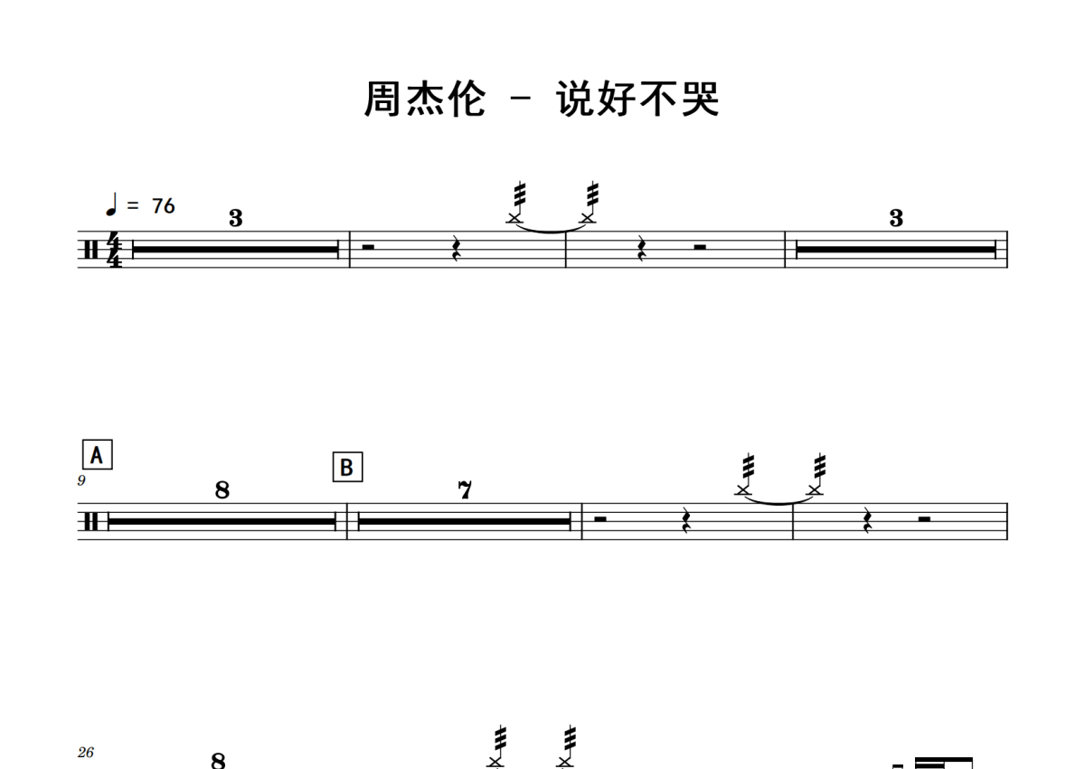《说好不哭》是周杰伦演唱的一首歌曲,拍号为4/4拍,歌曲速度为每分钟76拍,这份鼓谱共有两张高清图谱,图谱由 @老虎不说谎 编配上传,图谱使用五线谱编配,使用这份说好不哭架子鼓谱,你将能够轻松地敲打出这首周杰伦的说好不哭,快来尝试吧。