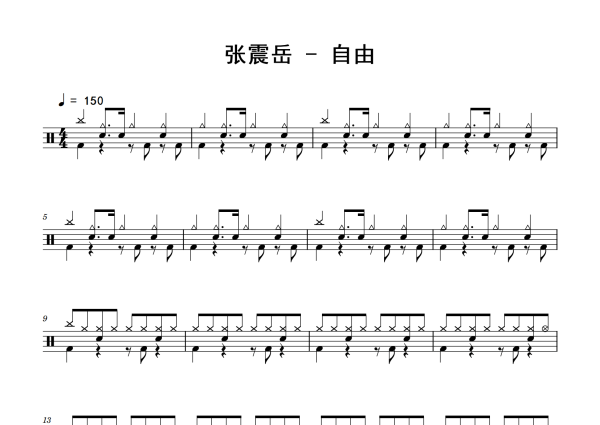 《自由》是张震岳演唱的一首歌曲,拍号为4/4拍,歌曲速度为每分钟150拍,这份鼓谱共有四张高清图谱,图谱由 @老虎不说谎 编配上传,图谱使用五线谱编配,使用这份自由架子鼓谱,你将能够轻松地敲打出这首张震岳的自由,快来尝试吧。