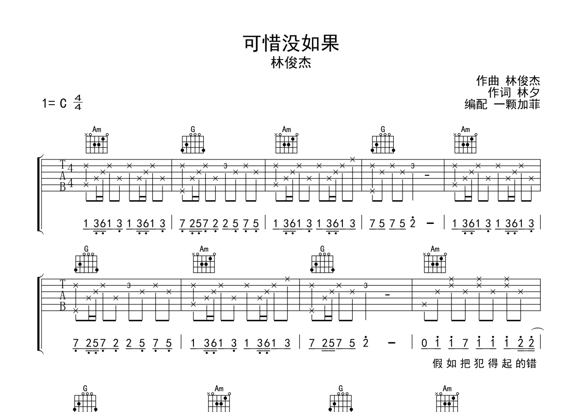 林俊杰《可惜没如果》吉他谱 - C调弹唱六线谱