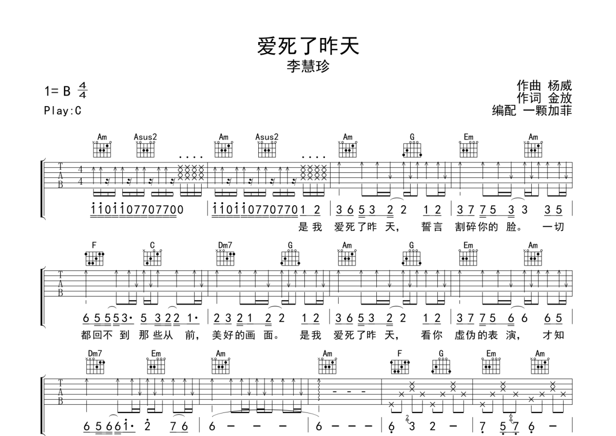 《爱死了昨天》是李慧珍演唱的一首歌曲,拍号为4/4拍,歌曲原调为B调,但由于原调指法比较难,为了方便弹奏,本吉他谱采用的是C调指法编配,这份吉他谱共有两张高清图谱,图谱由 @一颗加菲 编配上传,图谱使用六线谱编配,包含吉他和弦指法、简谱以及歌词部分,曲谱配备了相关的音频提供试听,使用这份爱死了昨天吉他谱,可以让你更加方便地掌握这首歌曲的弹唱技巧,快来尝试吧。
