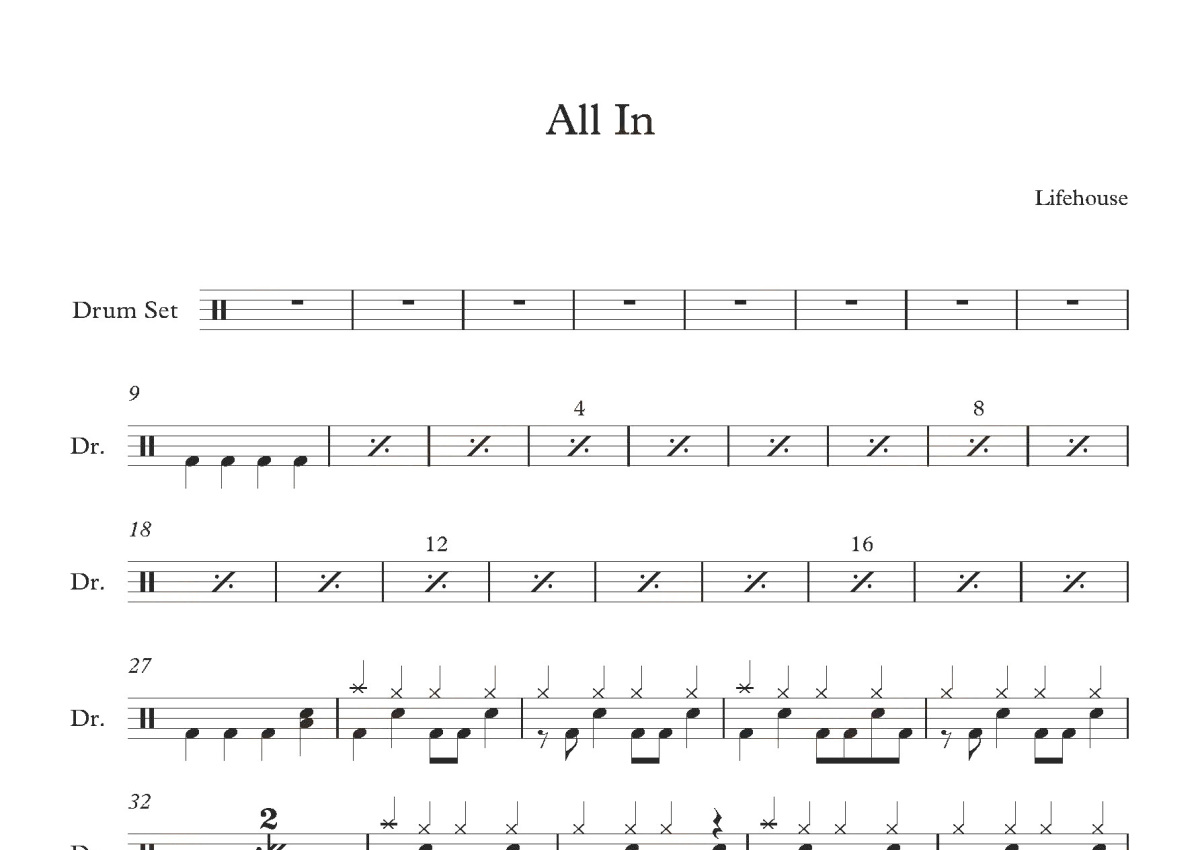 《All in》是livehouse演唱的一首歌曲,这份鼓谱共有两张高清图谱,图谱由 @打鼓谱 编配上传,图谱使用五线谱编配,使用这份All in架子鼓谱,你将能够轻松地敲打出这首livehouse的All in,快来尝试吧。首张收录专辑: Smoke & Mirrors 发行时间: 2010 年 流派: 硬摇滚。