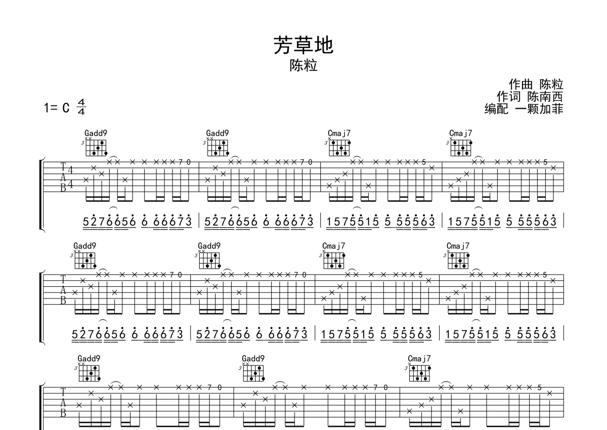 陈粒《芳草地》吉他谱 - C调弹唱六线谱