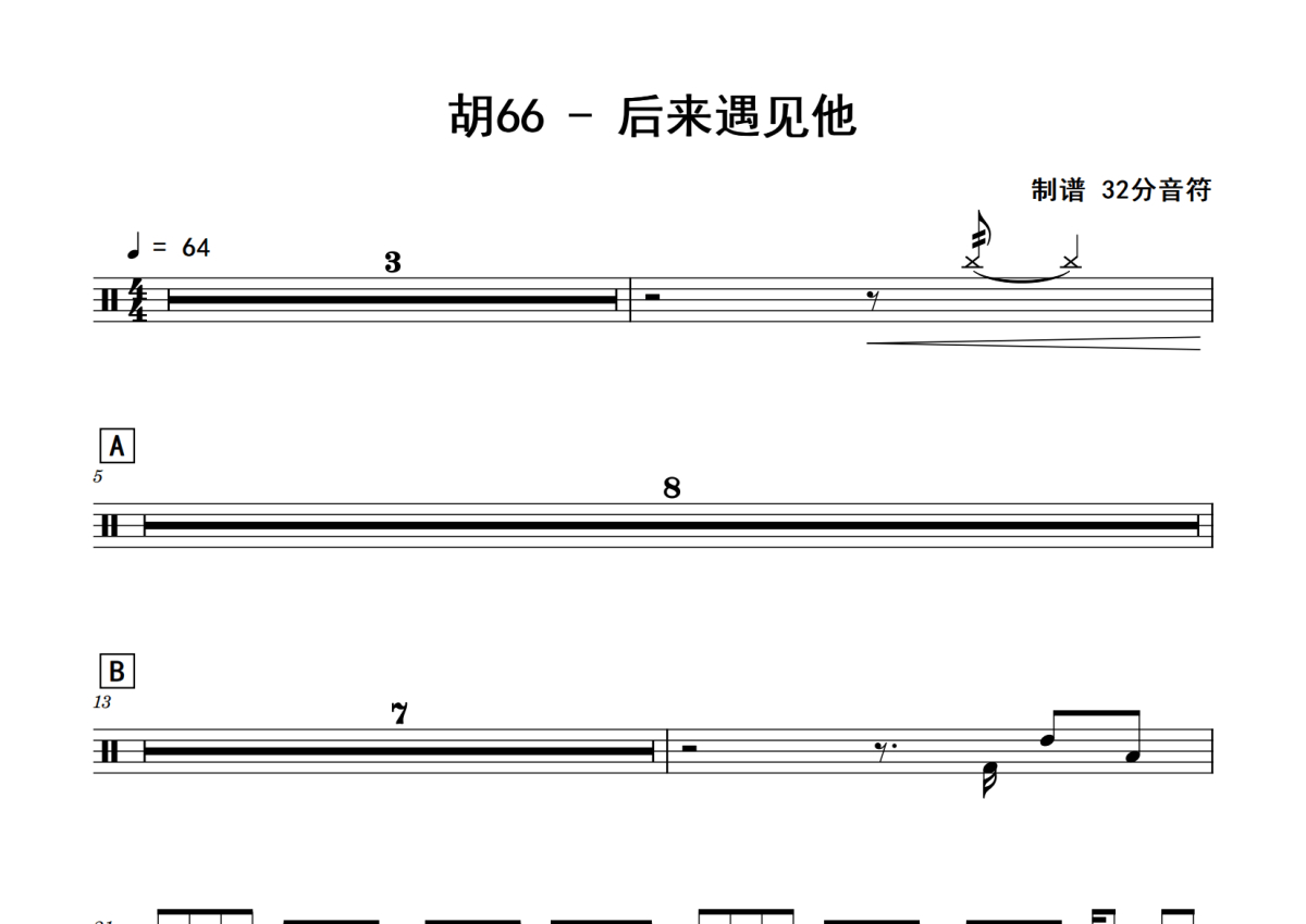 《后来遇见他》是胡66演唱的一首歌曲,拍号为4/4拍,歌曲速度为每分钟64拍,这份鼓谱共有两张高清图谱,图谱由 @老虎不说谎 编配上传,图谱使用五线谱编配,使用这份后来遇见他架子鼓谱,你将能够轻松地敲打出这首胡66的后来遇见他,快来尝试吧。