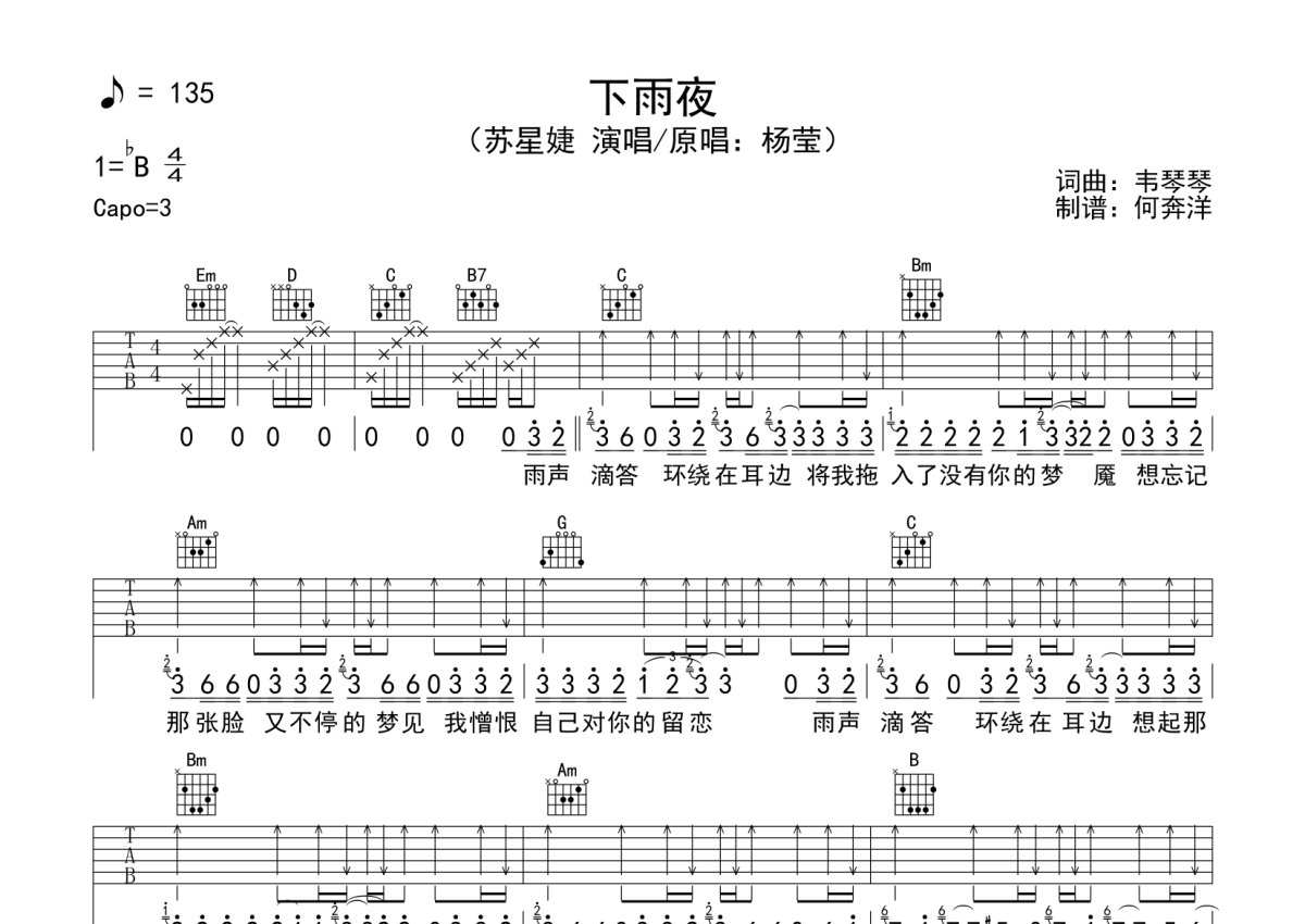 《下雨夜》是苏星婕演唱的一首歌曲,本吉他谱采用的是G调指法编配,这份吉他谱共有两张高清图谱,图谱由 @何奔洋 编配上传,图谱使用六线谱编配,包含吉他和弦指法、简谱以及歌词部分,曲谱配备了相关的音频提供试听,使用这份下雨夜吉他谱,可以让你更加方便地掌握这首歌曲的弹唱技巧,快来尝试吧。苏星婕《下雨夜》吉他谱_G调吉他弹唱谱。