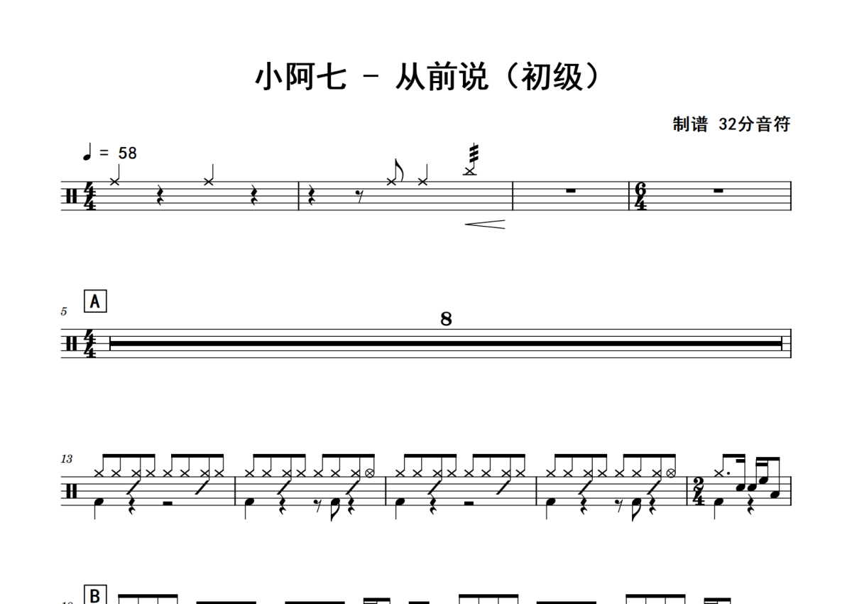 小阿七《从前说》鼓谱 - 架子鼓谱 - 初级