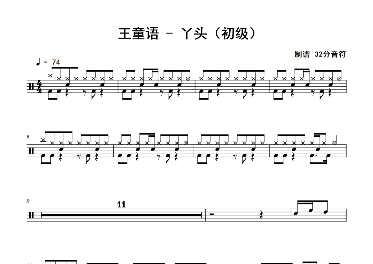 王童语《丫头》鼓谱 - 架子鼓谱 - 初级