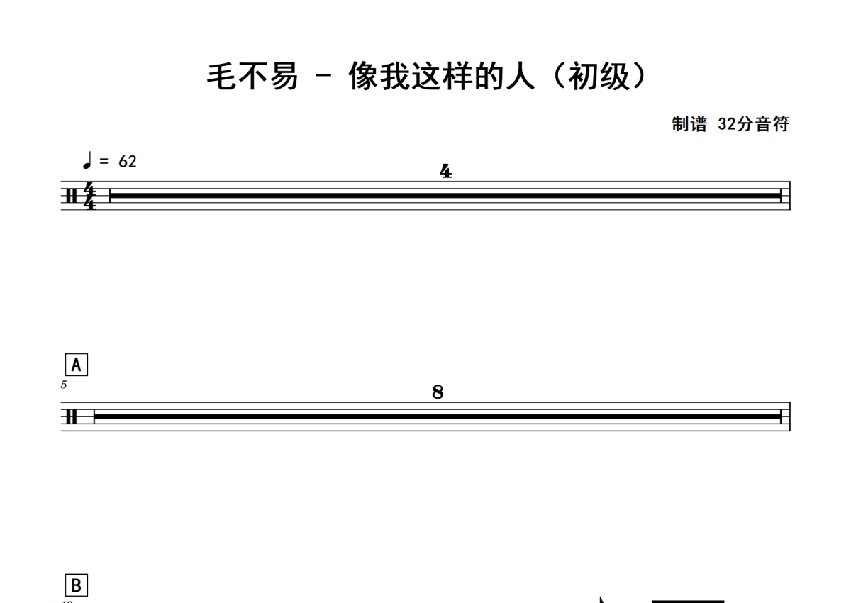 《像我这样的人》是毛不易演唱的一首歌曲,初级,歌曲速度为每分钟62拍,这份鼓谱共有两张高清图谱,图谱由 @老虎不说谎 编配上传,图谱使用五线谱编配,使用这份像我这样的人架子鼓谱,你将能够轻松地敲打出这首毛不易的像我这样的人,快来尝试吧。