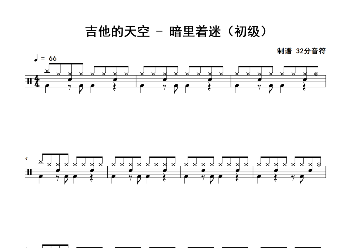 《暗里着迷》是吉他的天空演唱的一首歌曲,初级,拍号为4/4拍,歌曲速度为每分钟66拍,这份鼓谱共有三张高清图谱,图谱由 @老虎不说谎 编配上传,图谱使用五线谱编配,使用这份暗里着迷架子鼓谱,你将能够轻松地敲打出这首吉他的天空的暗里着迷,快来尝试吧。