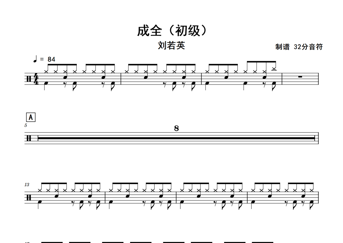 《成全》是刘若英演唱的一首歌曲,初级,歌曲速度为每分钟84拍,这份鼓谱共有三张高清图谱,图谱由 @老虎不说谎 编配上传,图谱使用五线谱编配,使用这份成全架子鼓谱,你将能够轻松地敲打出这首刘若英的成全,快来尝试吧。