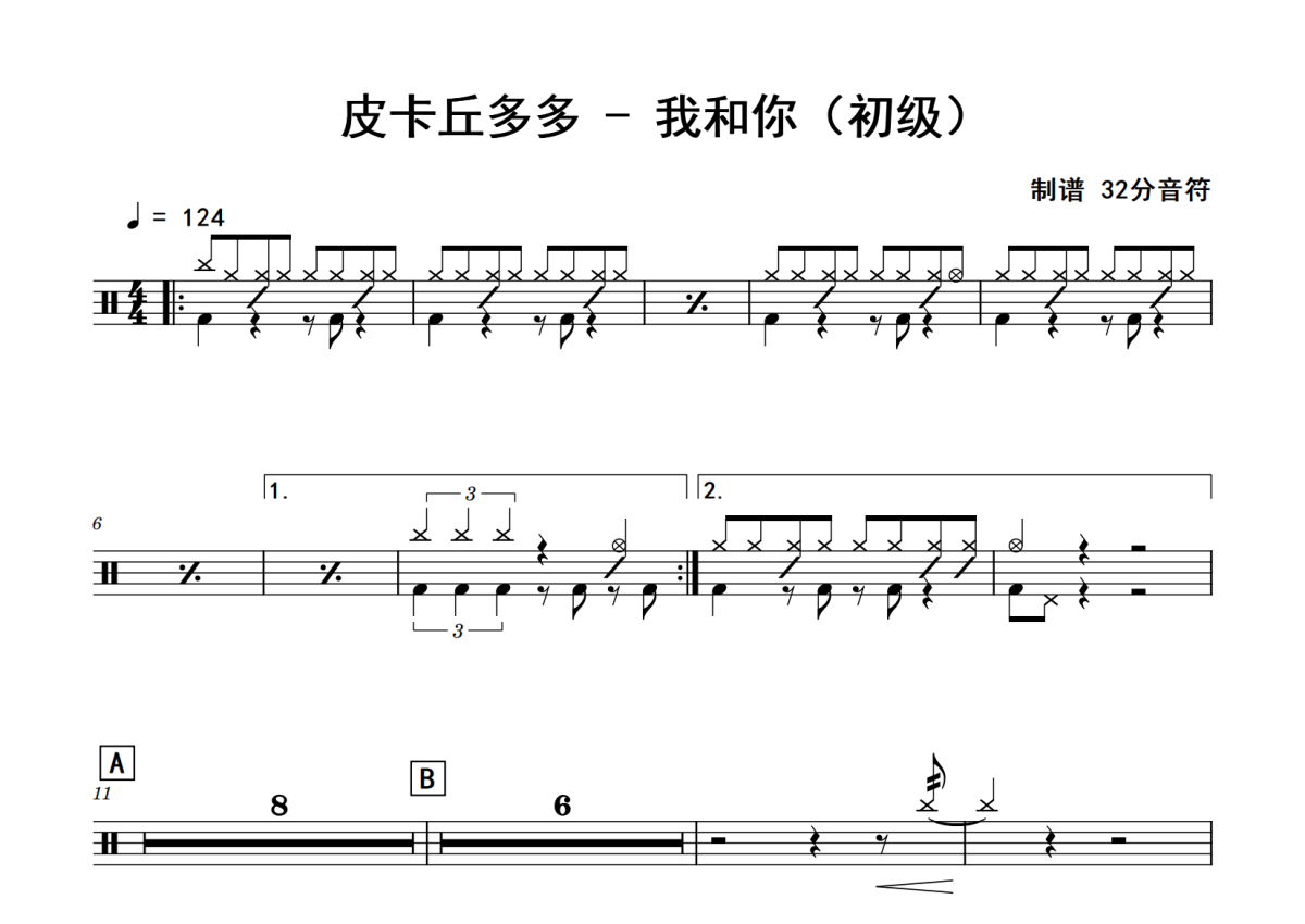 皮卡丘多多《我和你》鼓谱 - 架子鼓谱 - 初级