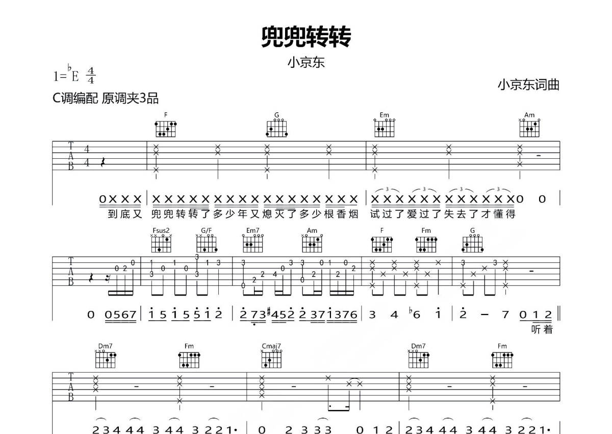 《兜兜转转》是小京东演唱的一首歌曲,拍号为4/4拍,歌曲速度为每分钟85拍,歌曲原调为Eb调,但由于原调指法比较难,为了方便弹奏,本吉他谱采用的是C调指法编配,变调夹3品弹奏即为原调,当然也可以根据自己的音域改变变调夹位置,或者通过改变和弦调性,以方便自己弹奏,这份吉他谱共有三张高清图谱,图谱由 @珺妹儿 编配上传,图谱使用六线谱编配,包含吉他和弦指法、简谱以及歌词部分,使用这份兜兜转转吉他谱,可以让你更加方便地掌握这首歌曲的弹唱技巧,快来尝试吧。