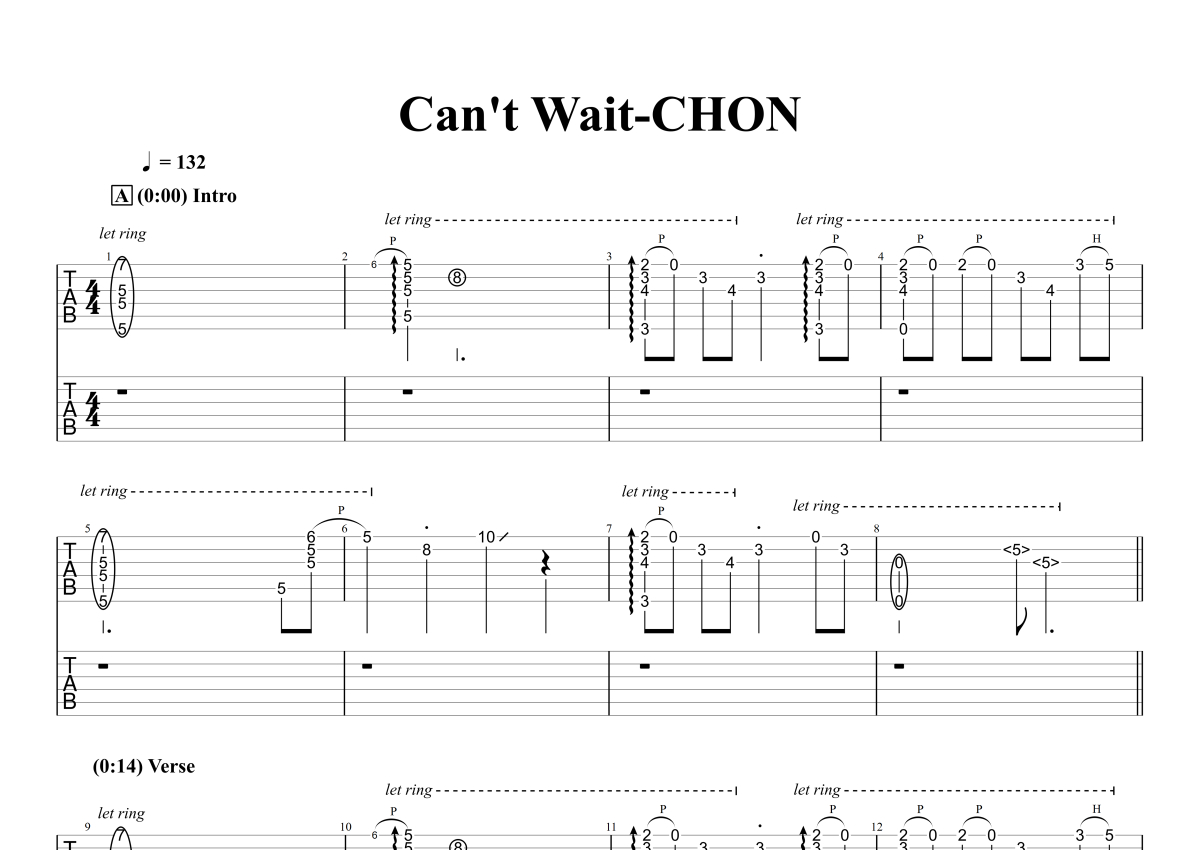 《Can't Wait》是CHON演唱的一首歌曲,石头音乐原版记谱,拍号为4/4拍,歌曲速度为每分钟132拍,歌曲原调为G调,演奏时不需要使用变调夹即为原调,这份电吉他谱共有五张高清图谱,图谱由 @石头音乐 编配上传,图谱使用六线谱编配,曲谱配备了相关的音频提供试听,使用这份Can't Wait电吉他谱,可以让你更加方便地掌握这首歌曲的演奏技巧,快来尝试吧。