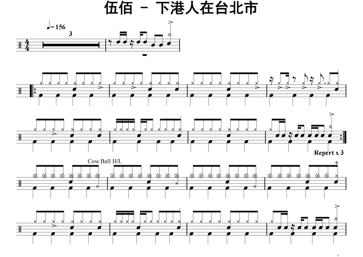 《下港人在台北市》是伍佰演唱的一首歌曲,拍号为4/4拍,歌曲速度为每分钟156拍,这份鼓谱共有三张高清图谱,图谱由 @老虎不说谎 编配上传,图谱使用五线谱编配,使用这份下港人在台北市架子鼓谱,你将能够轻松地敲打出这首伍佰的下港人在台北市,快来尝试吧。