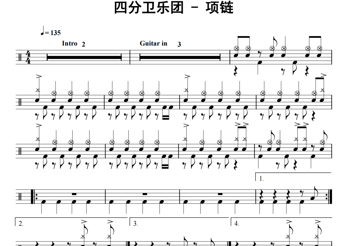 《项链》是四分卫乐团演唱的一首歌曲,拍号为4/4拍,歌曲速度为每分钟135拍,这份鼓谱共有三张高清图谱,图谱由 @老虎不说谎 编配上传,图谱使用五线谱编配,使用这份项链架子鼓谱,你将能够轻松地敲打出这首四分卫乐团的项链,快来尝试吧。