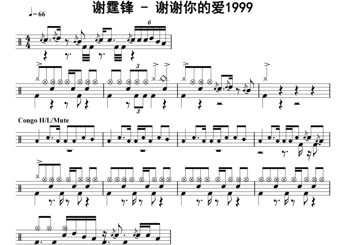 《谢谢你的爱1999》是谢霆锋演唱的一首歌曲,拍号为4/4拍,歌曲速度为每分钟66拍,这份鼓谱共有两张高清图谱,图谱由 @老虎不说谎 编配上传,图谱使用五线谱编配,使用这份谢谢你的爱1999架子鼓谱,你将能够轻松地敲打出这首谢霆锋的谢谢你的爱1999,快来尝试吧。
