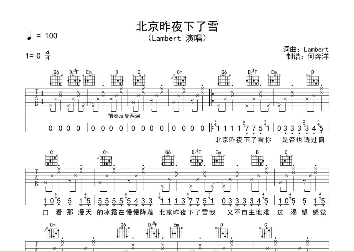 Lambert《北京昨夜下了雪》吉他谱 - G调弹唱六线谱