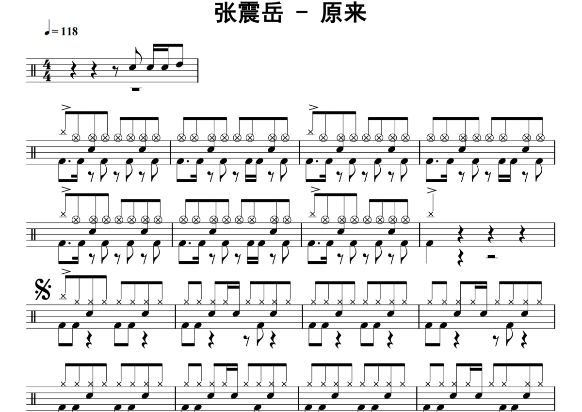《原来》是张震岳演唱的一首歌曲,拍号为4/4拍,歌曲速度为每分钟118拍,这份鼓谱共有四张高清图谱,图谱由 @老虎不说谎 编配上传,图谱使用五线谱编配,使用这份原来架子鼓谱,你将能够轻松地敲打出这首张震岳的原来,快来尝试吧。