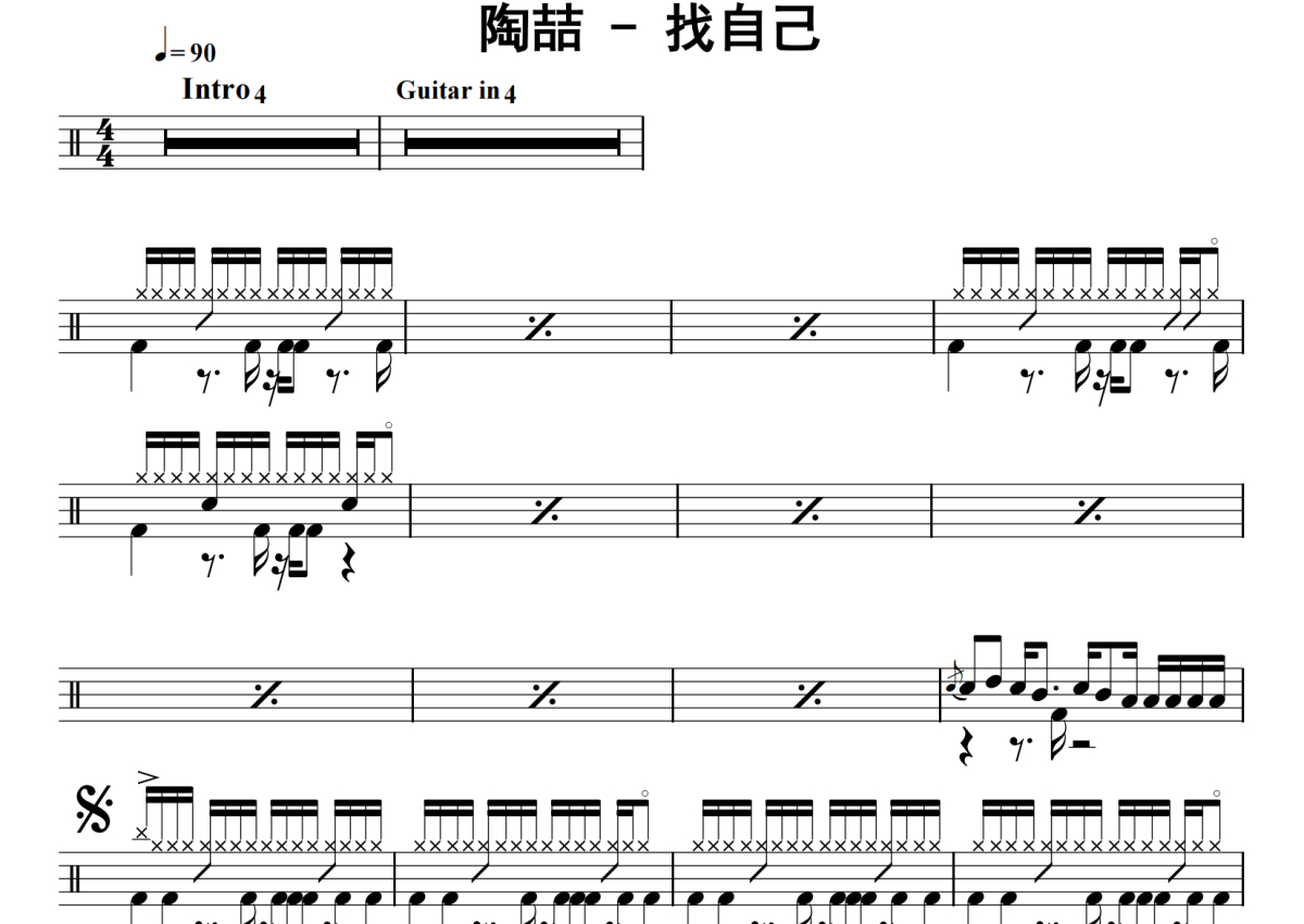 《找自己》是陶喆演唱的一首歌曲,拍号为4/4拍,歌曲速度为每分钟90拍,这份鼓谱共有两张高清图谱,图谱由 @老虎不说谎 编配上传,图谱使用五线谱编配,使用这份找自己架子鼓谱,你将能够轻松地敲打出这首陶喆的找自己,快来尝试吧。