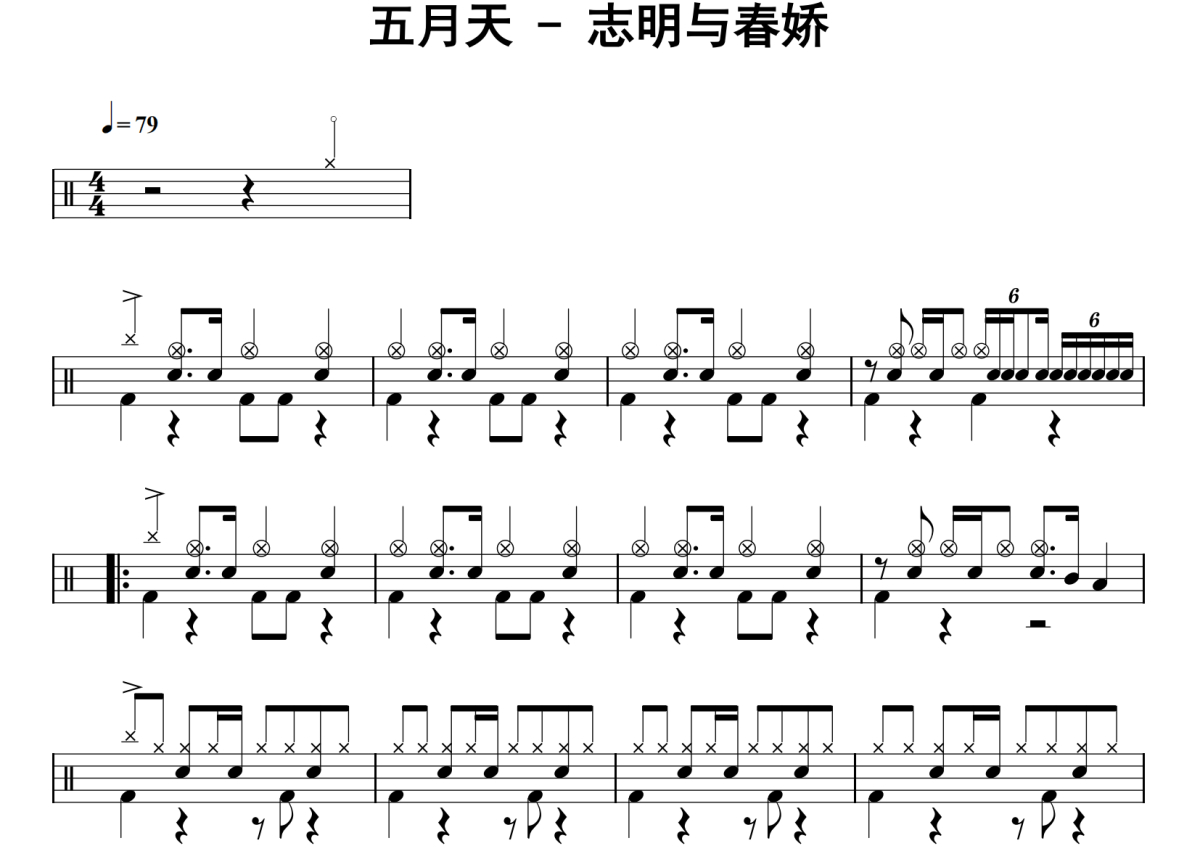 《志明与春娇》是五月天演唱的一首歌曲,拍号为4/4拍,歌曲速度为每分钟79拍,这份鼓谱共有三张高清图谱,图谱由 @老虎不说谎 编配上传,图谱使用五线谱编配,使用这份志明与春娇架子鼓谱,你将能够轻松地敲打出这首五月天的志明与春娇,快来尝试吧。