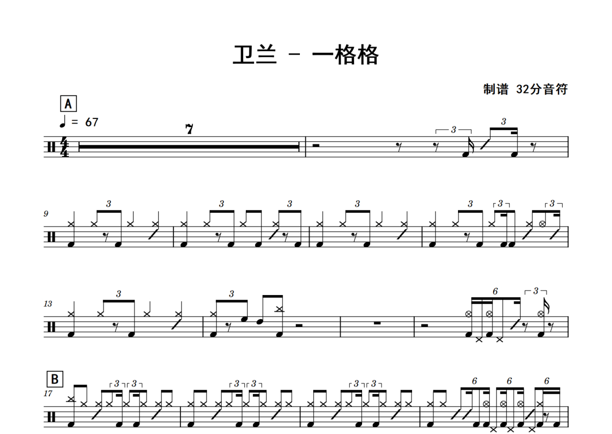 《一格格》是卫兰演唱的一首歌曲,拍号为4/4拍,歌曲速度为每分钟67拍,这份鼓谱共有两张高清图谱,图谱由 @老虎不说谎 编配上传,图谱使用五线谱编配,使用这份一格格架子鼓谱,你将能够轻松地敲打出这首卫兰的一格格,快来尝试吧。