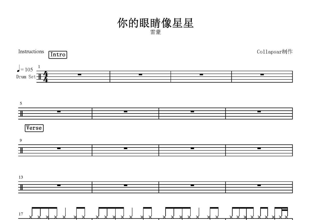 《你的眼睛像星星》是雷蒙演唱的一首歌曲,这份鼓谱共有三张高清图谱,图谱由 @打鼓谱 编配上传,图谱使用五线谱编配,使用这份你的眼睛像星星架子鼓谱,你将能够轻松地敲打出这首雷蒙的你的眼睛像星星,快来尝试吧。1。