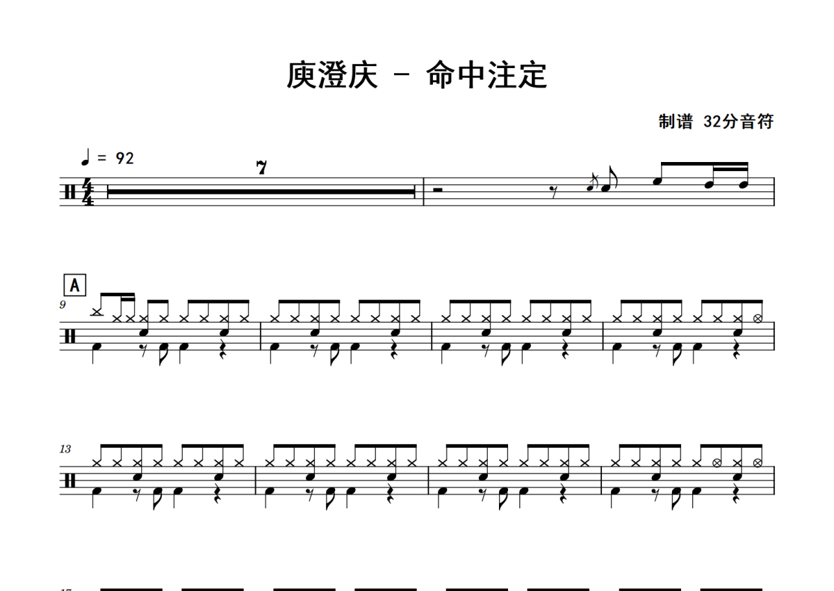 《命中注定》是庾澄庆演唱的一首歌曲,拍号为4/4拍,歌曲速度为每分钟92拍,这份鼓谱共有三张高清图谱,图谱由 @老虎不说谎 编配上传,图谱使用五线谱编配,使用这份命中注定架子鼓谱,你将能够轻松地敲打出这首庾澄庆的命中注定,快来尝试吧。