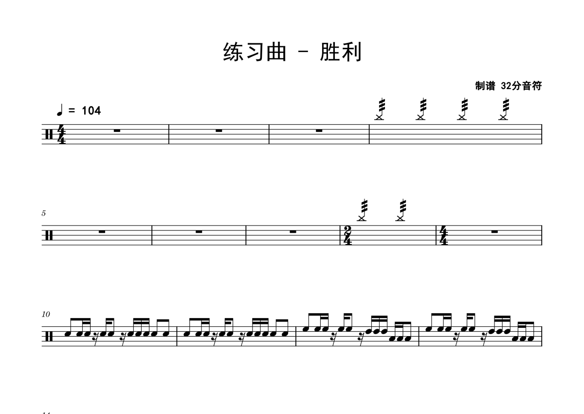 《胜利》是练习曲演唱的一首歌曲,练习曲,拍号为4/4拍,歌曲速度为每分钟104拍,这份鼓谱共有三张高清图谱,图谱由 @老虎不说谎 编配上传,图谱使用五线谱编配,使用这份胜利架子鼓谱,你将能够轻松地敲打出这首练习曲的胜利,快来尝试吧。