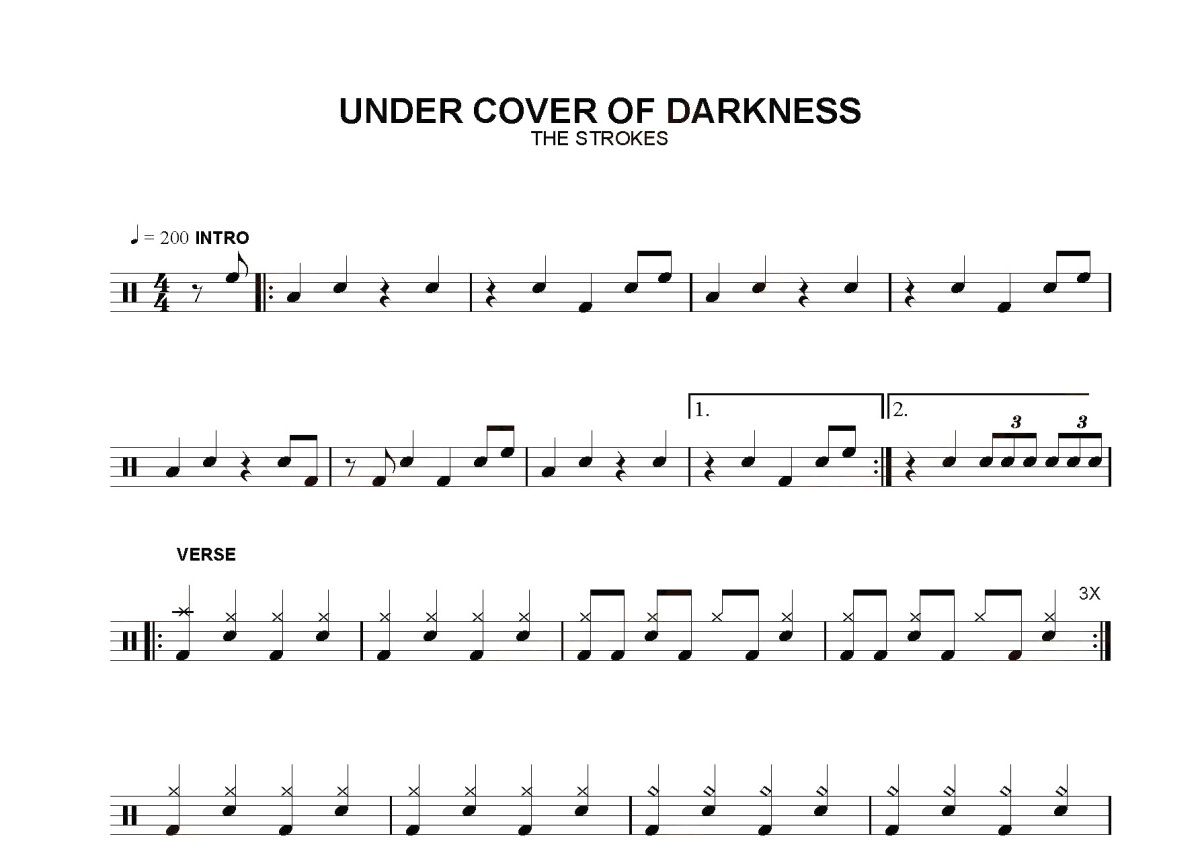 《under cover of darkness》是strokes演唱的一首歌曲,这份鼓谱共有三张高清图谱,图谱由 @打鼓谱 编配上传,图谱使用五线谱编配,使用这份under cover of darkness架子鼓谱,你将能够轻松地敲打出这首strokes的under cover of darkness,快来尝试吧。《under cover of darkness》现场版。鼓击乐团(The Strokes)是一支在21世纪初成名的纽约另类摇滚乐团。 鼓击乐团是当代美国独立摇滚代表乐团之一。不过与绝大多数美国摇滚乐团不同的是,他们的音乐更多的带有英伦摇滚的特点。