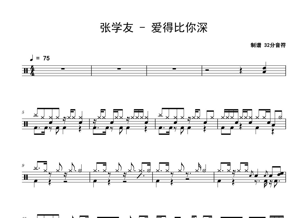 《爱得比你深》是张学友演唱的一首歌曲,拍号为4/4拍,歌曲速度为每分钟75拍,这份鼓谱共有三张高清图谱,图谱由 @老虎不说谎 编配上传,图谱使用五线谱编配,使用这份爱得比你深架子鼓谱,你将能够轻松地敲打出这首张学友的爱得比你深,快来尝试吧。