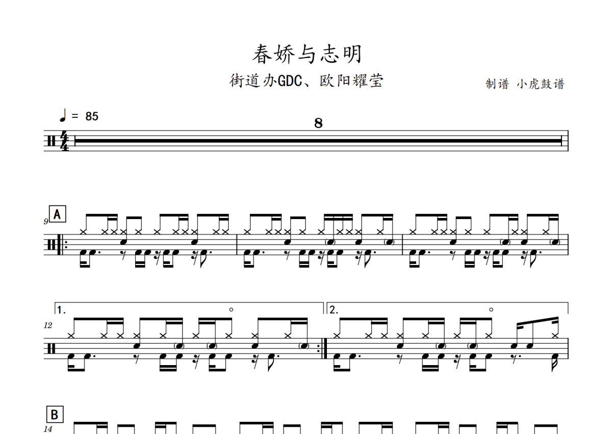 《春娇与志明》是街道办GDC/欧阳耀莹演唱的一首歌曲,拍号为4/4拍,歌曲速度为每分钟85拍,这份鼓谱共有两张高清图谱,图谱由 @老虎不说谎 编配上传,图谱使用五线谱编配,使用这份春娇与志明架子鼓谱,你将能够轻松地敲打出这首街道办GDC/欧阳耀莹的春娇与志明,快来尝试吧。