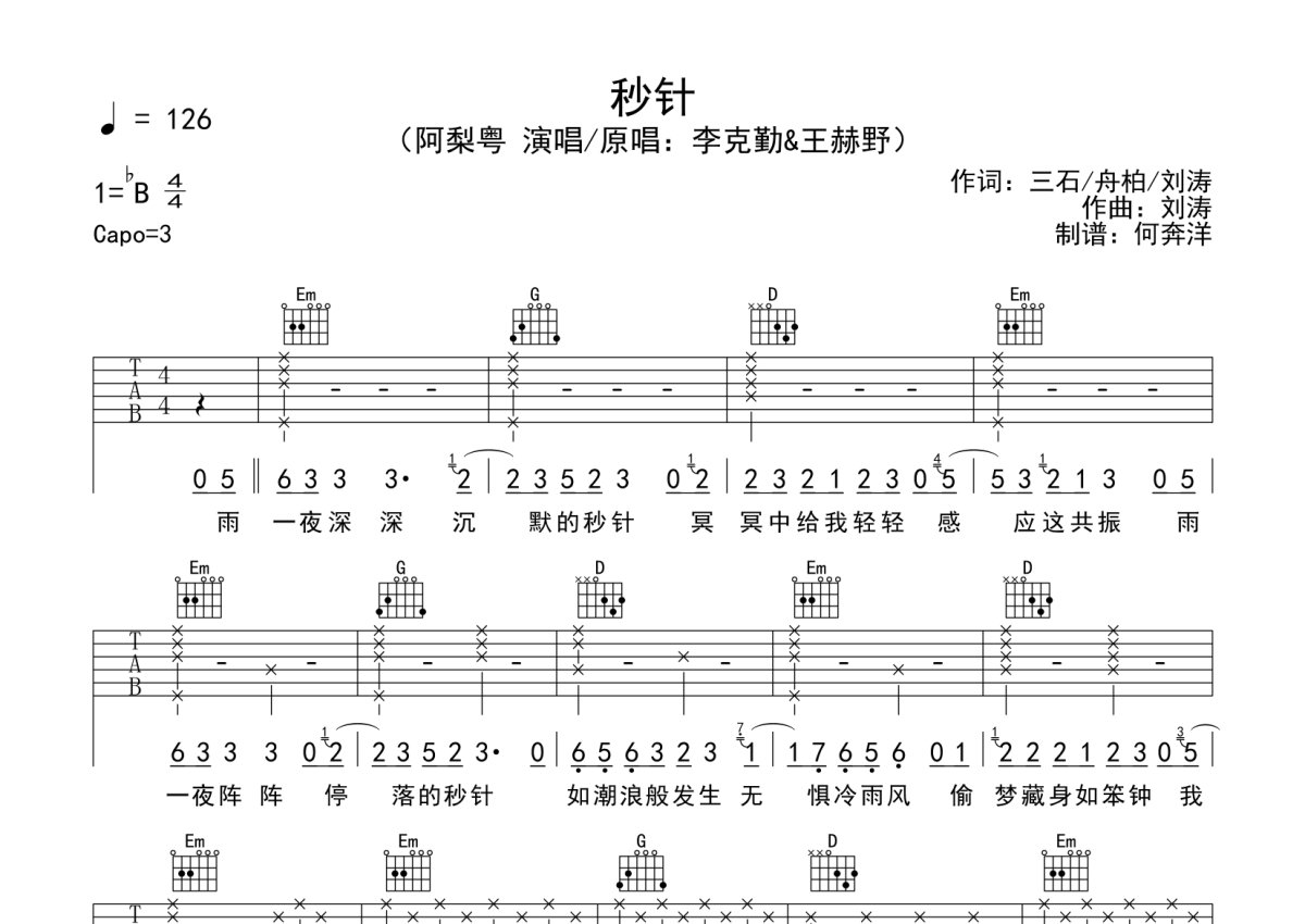 《秒针》是阿梨粤演唱的一首歌曲,本吉他谱采用的是G调指法编配,这份吉他谱共有两张高清图谱,图谱由 @何奔洋 编配上传,图谱使用六线谱编配,包含吉他和弦指法、简谱以及歌词部分,曲谱配备了相关的音频提供试听,使用这份秒针吉他谱,可以让你更加方便地掌握这首歌曲的弹唱技巧,快来尝试吧。原版节奏型,可以根据自身习惯自由处理。