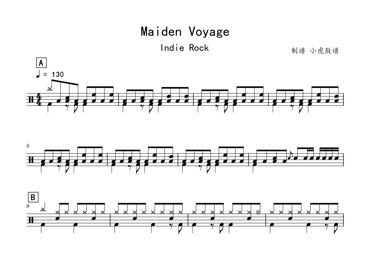 《Maiden_Voyage》是rockschool演唱的一首歌曲,拍号为4/4拍,歌曲速度为每分钟130拍,这份鼓谱共有两张高清图谱,图谱由 @老虎不说谎 编配上传,图谱使用五线谱编配,使用这份Maiden_Voyage架子鼓谱,你将能够轻松地敲打出这首rockschool的Maiden_Voyage,快来尝试吧。