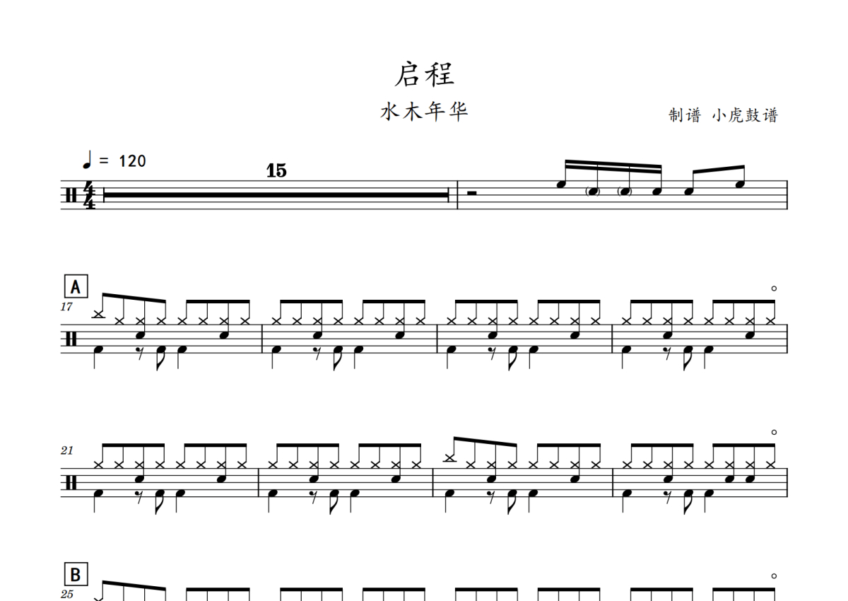 《启程》是水木年华演唱的一首歌曲,拍号为4/4拍,歌曲速度为每分钟120拍,这份鼓谱共有四张高清图谱,图谱由 @老虎不说谎 编配上传,图谱使用五线谱编配,使用这份启程架子鼓谱,你将能够轻松地敲打出这首水木年华的启程,快来尝试吧。