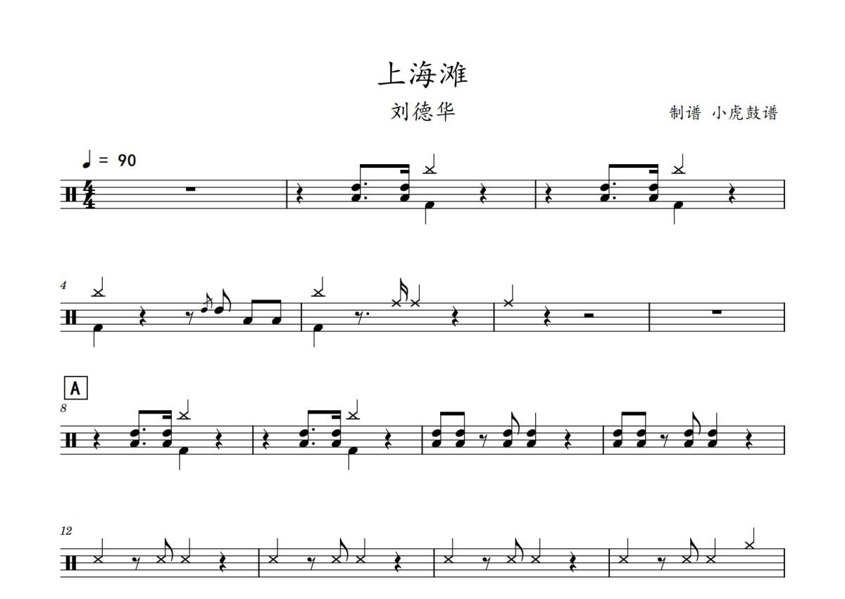 《上海滩》是刘德华演唱的一首歌曲,拍号为4/4拍,歌曲速度为每分钟90拍,这份鼓谱共有两张高清图谱,图谱由 @老虎不说谎 编配上传,图谱使用五线谱编配,使用这份上海滩架子鼓谱,你将能够轻松地敲打出这首刘德华的上海滩,快来尝试吧。