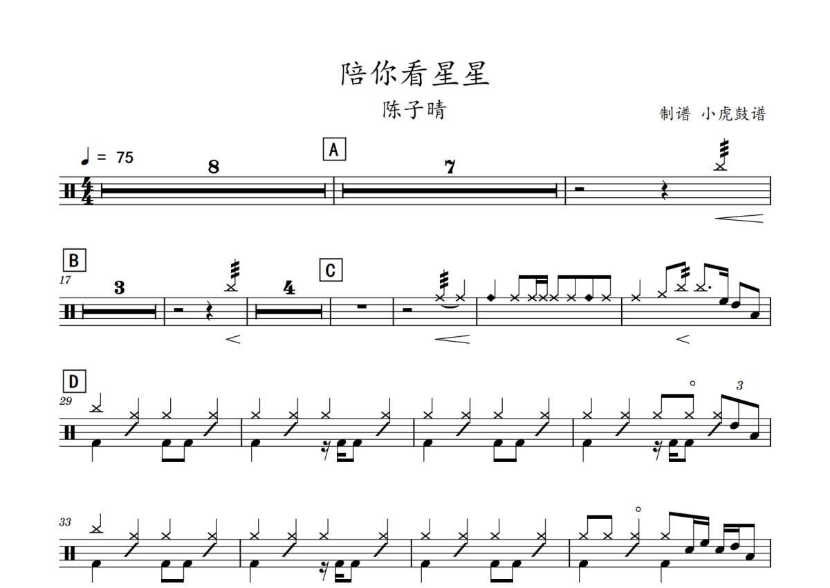 《陪你看星星》是陈子晴演唱的一首歌曲,拍号为4/4拍,歌曲速度为每分钟75拍,这份鼓谱共有一张高清图谱,图谱由 @老虎不说谎 编配上传,图谱使用五线谱编配,使用这份陪你看星星架子鼓谱,你将能够轻松地敲打出这首陈子晴的陪你看星星,快来尝试吧。