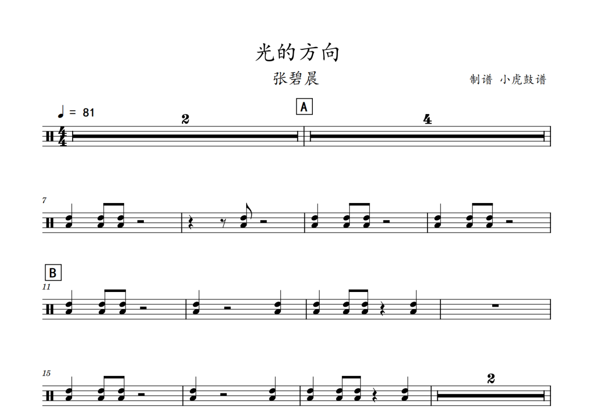 《光的方向》是张碧晨演唱的一首歌曲,拍号为4/4拍,歌曲速度为每分钟81拍,这份鼓谱共有两张高清图谱,图谱由 @老虎不说谎 编配上传,图谱使用五线谱编配,使用这份光的方向架子鼓谱,你将能够轻松地敲打出这首张碧晨的光的方向,快来尝试吧。