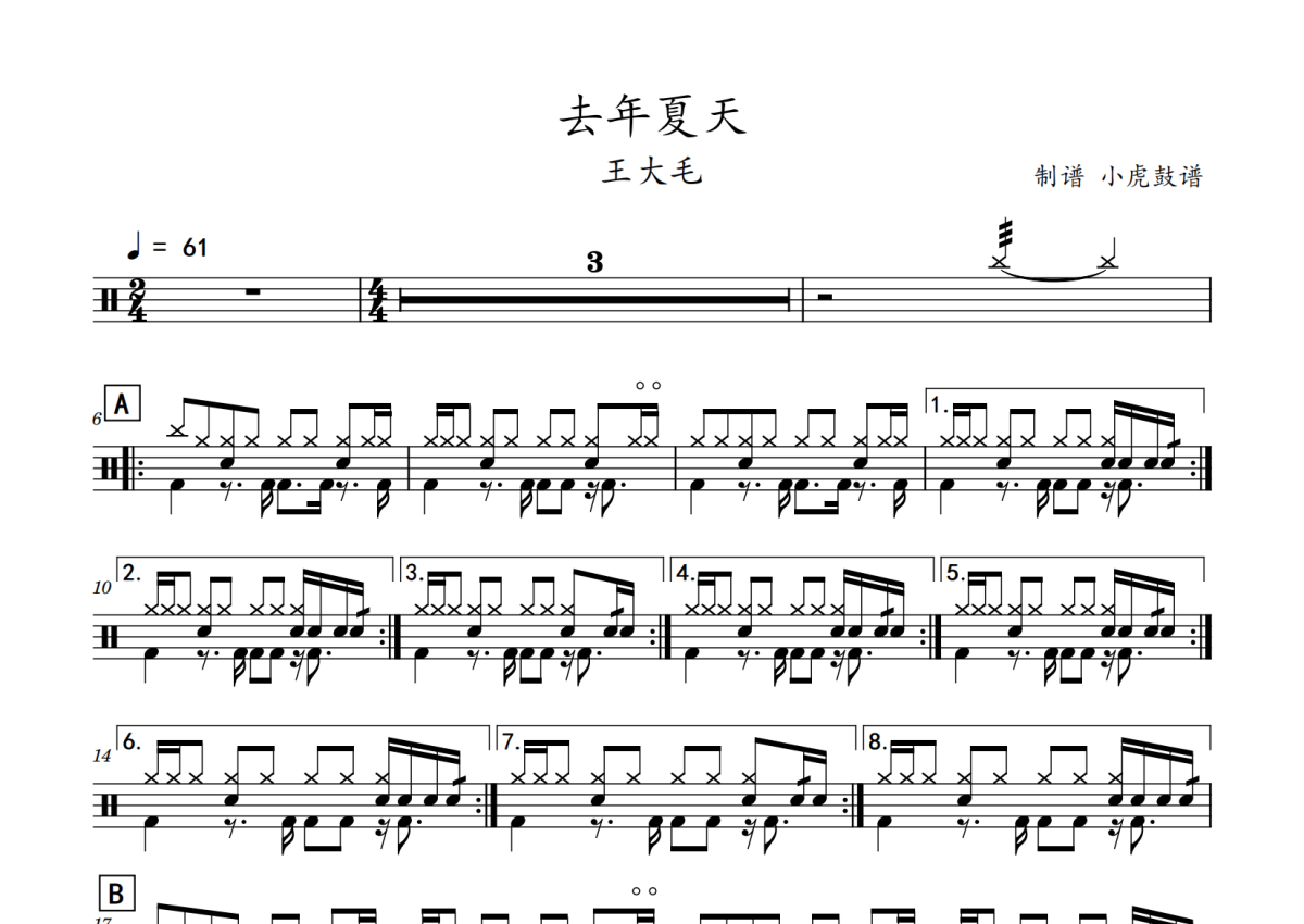 《去年夏天》是王大毛演唱的一首歌曲,拍号为4/4拍,歌曲速度为每分钟61拍,这份鼓谱共有一张高清图谱,图谱由 @老虎不说谎 编配上传,图谱使用五线谱编配,使用这份去年夏天架子鼓谱,你将能够轻松地敲打出这首王大毛的去年夏天,快来尝试吧。