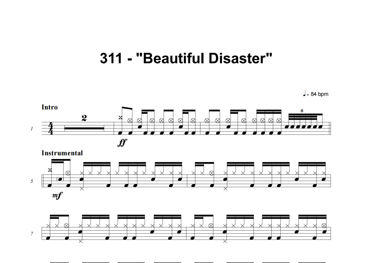 《Beautiful Disaster》是311演唱的一首歌曲,拍号为4/4拍,歌曲速度为每分钟84拍,这份鼓谱共有五张高清图谱,图谱由 @老虎不说谎 编配上传,图谱使用五线谱编配,使用这份Beautiful Disaster架子鼓谱,你将能够轻松地敲打出这首311的Beautiful Disaster,快来尝试吧。