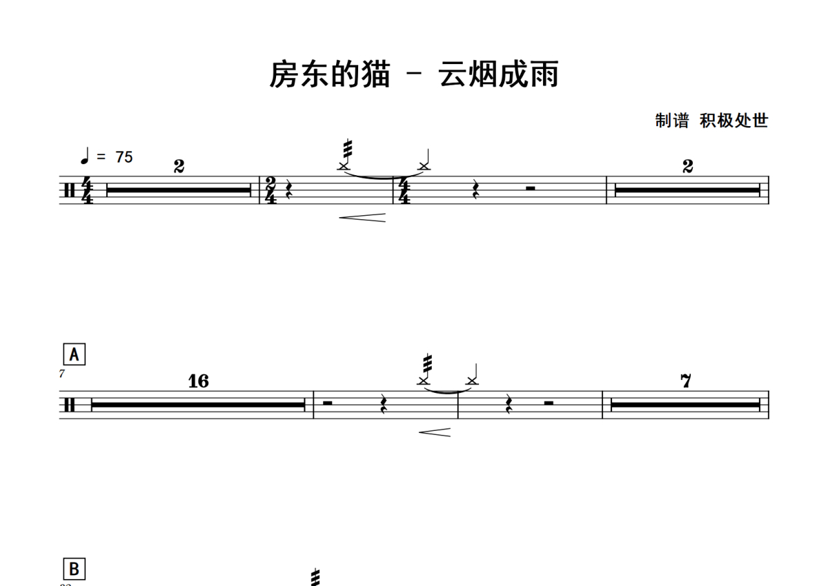 《云烟成雨》是房东的猫演唱的一首歌曲,拍号为4/4拍,歌曲速度为每分钟75拍,这份鼓谱共有两张高清图谱,图谱由 @老虎不说谎 编配上传,图谱使用五线谱编配,使用这份云烟成雨架子鼓谱,你将能够轻松地敲打出这首房东的猫的云烟成雨,快来尝试吧。