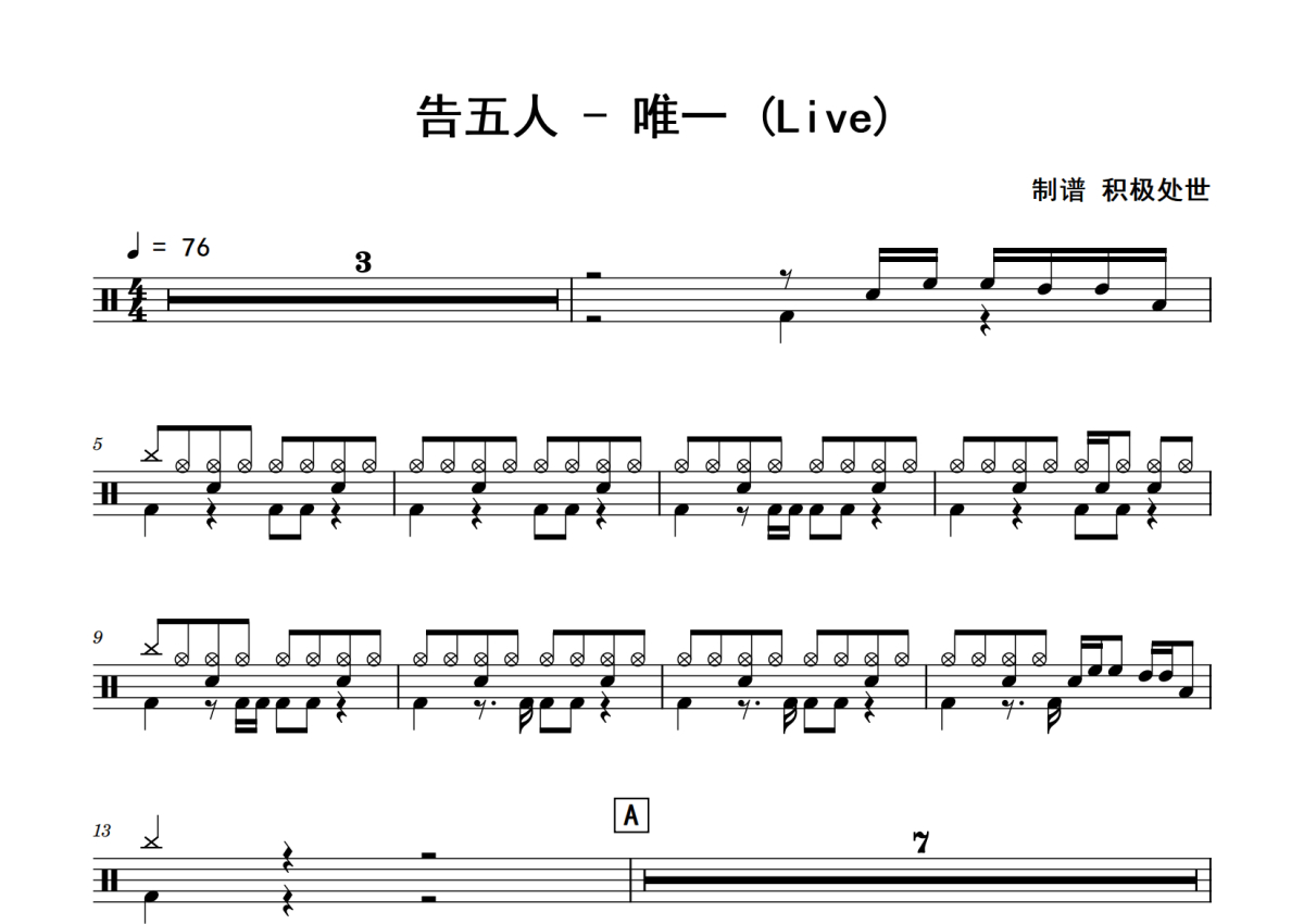 告五人《唯一》鼓谱 - 架子鼓谱 - Live