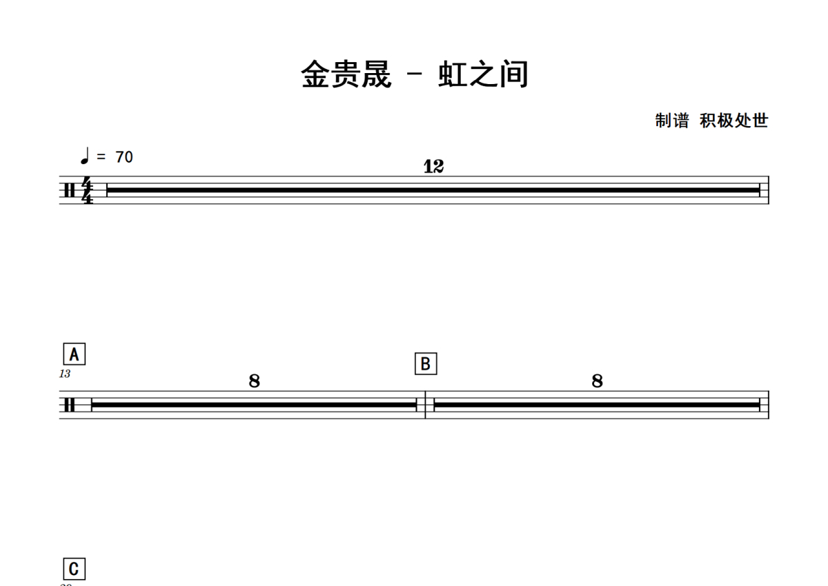 《虹之间》是金贵晟演唱的一首歌曲,拍号为4/4拍,歌曲速度为每分钟70拍,这份鼓谱共有两张高清图谱,图谱由 @老虎不说谎 编配上传,图谱使用五线谱编配,使用这份虹之间架子鼓谱,你将能够轻松地敲打出这首金贵晟的虹之间,快来尝试吧。