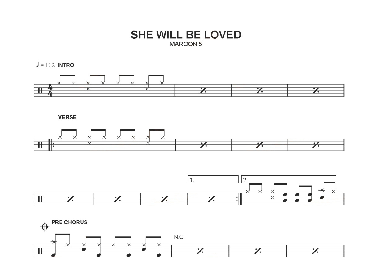 《she will be loved》是maroon 5演唱的一首歌曲,这份鼓谱共有两张高清图谱,图谱由 @打鼓谱 编配上传,图谱使用五线谱编配,使用这份she will be loved架子鼓谱,你将能够轻松地敲打出这首maroon 5的she will be loved,快来尝试吧。首张收录专辑: 珍 情歌
