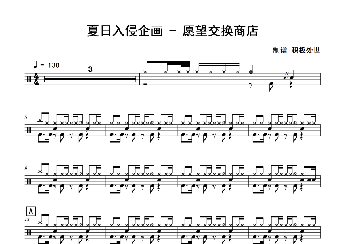 《愿望交换商店》是夏日入侵企画演唱的一首歌曲,拍号为4/4拍,歌曲速度为每分钟130拍,这份鼓谱共有三张高清图谱,图谱由 @老虎不说谎 编配上传,图谱使用五线谱编配,使用这份愿望交换商店架子鼓谱,你将能够轻松地敲打出这首夏日入侵企画的愿望交换商店,快来尝试吧。