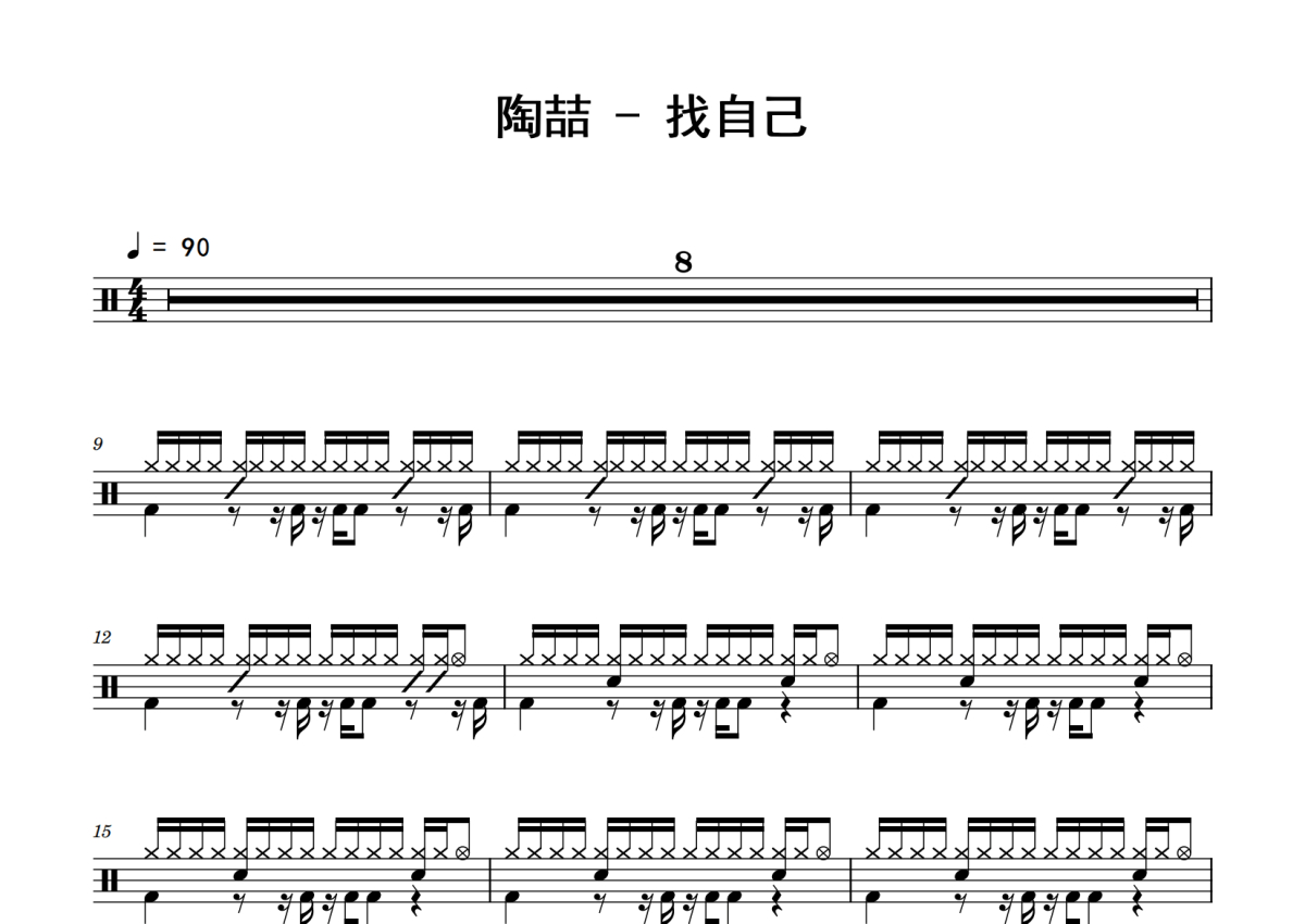 《找自己》是陶喆演唱的一首歌曲,拍号为4/4拍,歌曲速度为每分钟90拍,这份鼓谱共有三张高清图谱,图谱由 @老虎不说谎 编配上传,图谱使用五线谱编配,使用这份找自己架子鼓谱,你将能够轻松地敲打出这首陶喆的找自己,快来尝试吧。